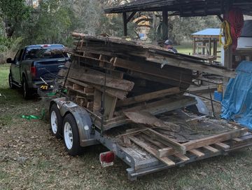 Tear down services are a flat rate of $150 per hour. Dump fees are a flat $100 per trip plus dump fees at-cost. (You are welcome to follow us to the dump and use your allotment to save on dump fees).